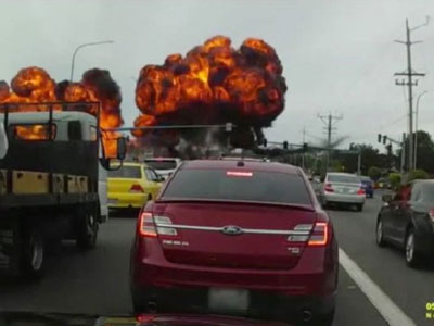 Máy bay xẹt qua đường, phát nổ trên đầu xe hơi