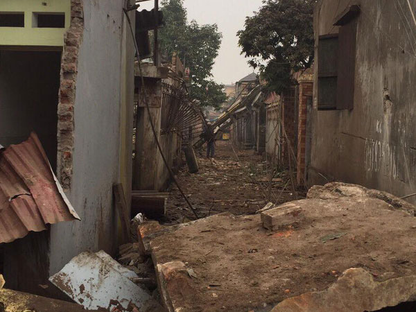 Áp lực từ vụ nổ kho phế liệu chưa đầu đạn vào lúc 4h30 sáng nay làm sập toàn bộ 5 ngôi nhà sát hiện trường, 2 cháu bé tử vong, nhiều người lớn bị thương nặng.