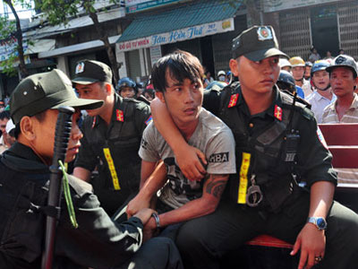 Tân xông vào nhiều gia đình hét to "báo công an gấp, người ta đuổi giết tôi" rồi cầm gạch, thanh sắt leo lên mái tiệm trà trên đường Quang Trung (TP Quảng Ngãi).