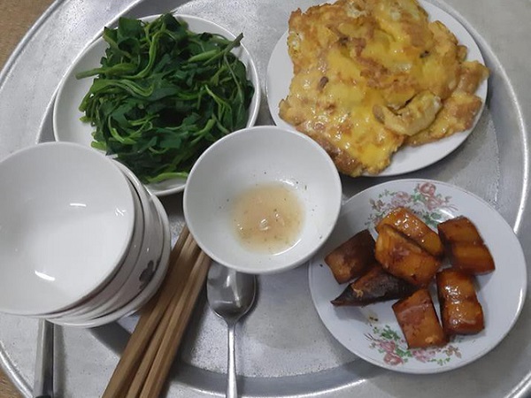 Vẫn là mâm cơm đạm bạc đang nổi mấy ngày gần đây nhưng khổ nỗi, phải ăn bữa cơm đơn giản thế này chẳng phải vì muốn đổi món mà vì cả hai vợ chồng "ngu" đã từ chối mang đồ từ quê lên.
