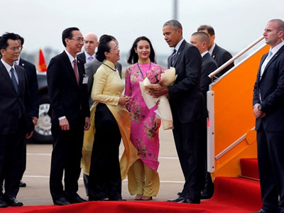 Hàng nghìn người dân mang theo cờ hoa, băng rôn đứng dọc hai bên đường từ sân bay Tân Sơn Nhất vào trung tâm TP HCM và ở chùa Ngọc Hoàng để chờ Tổng thống Obama.