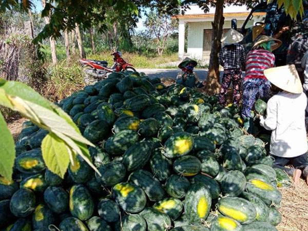 Dưa hấu tại huyện Phú Ninh, Quảng Nam đến thời điểm thu hoạch, giá bán hơn 1.000 đồng/kg nhưng vẫn không có người mua.