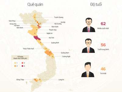Các thành viên chính phủ mới có tuổi trung bình 56, người trẻ nhất 46 tuổi. Hà Tĩnh là quê của nhiều thành viên chính phủ nhất, với 4 người.