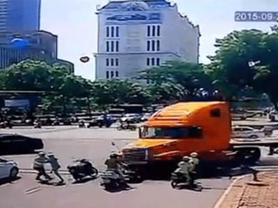 Giữa dòng xe cộ đông đúc đang chờ đèn đỏ trên đại lộ, chiếc xe ben bất ngờ mất lái, để tránh tai nạn thảm khốc có thể xảy ra tài xế đã lao thẳng xe vào trụ điện bên đường.