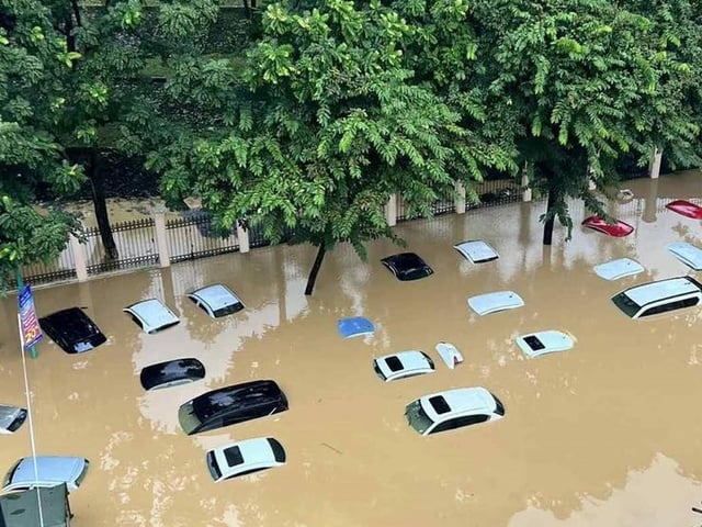 Mưa lớn, nước đổ về cuồn cuộn, nhiều tuyến đường, nhà dân, ô tô ngập chìm trong nước lũ.