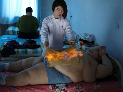Cậu bé Trung Quốc hét lên trong sợ hãi khi bác sĩ đốt chiếc khăn lớn đặt trên chiếc bụng ngấn mỡ của em để giúp giảm béo.