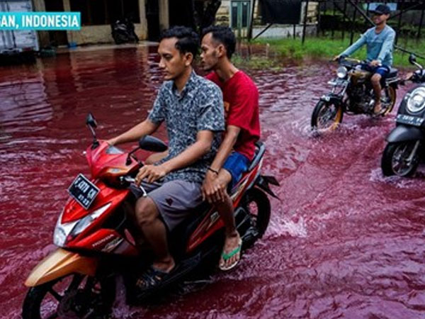 Ngôi làng Jenggot của Indonesia ngập trong dòng nước màu đỏ sau khi lũ lụt tràn qua một nhà máy sản xuất vải gần đó.