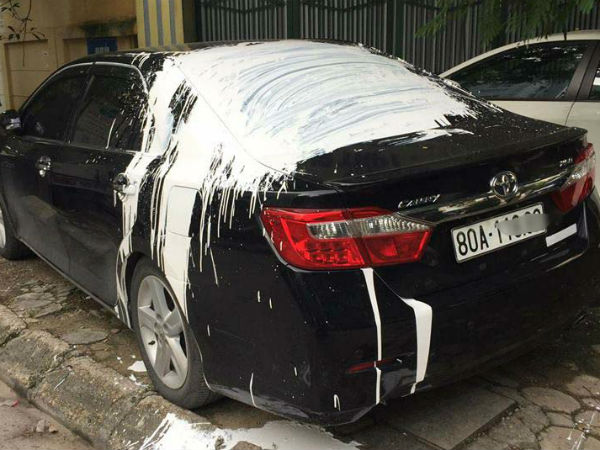 Buổi sáng thức dậy nhiều người dân thấy “xế hộp” biển 80A bị đổ sơn màu trắng lên khắp nóc xe.