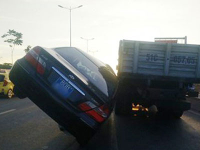Chiếc xe ô tô biển xanh 80B bất ngờ đâm vào đuôi xe tải phía trước rồi mắc kẹt và bị 'kéo lê' hàng chục mét như phim hành động khiến tài xế trọng thương.
