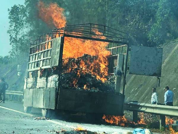 Ô tô tải bốc cháy trên cao tốc Nội Bài - Lào Cai