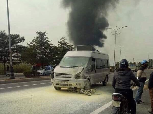 Đang dừng đỗ bên đường, chiếc ôtô 9 chỗ bỗng dưng phát hỏa. Trong ít phút, ngọn lửa bao trùm thân xe, cột khói bốc cao hàng chục mét.