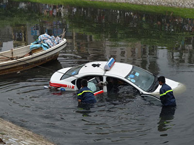 Chiếc xe taxi 4 chỗ đang đỗ bên đường bỗng rú ga lao lên vỉa hè, đâm đổ lan can, rơi xuống sông Tô Lịch. Khi chiếc xe chuẩn bị chìm, người lái xe đã đẩy cửa bơi ra ngoài.