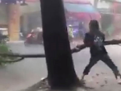 Bất chấp mưa to gió lớn, nam thanh niên kéo cây đổ vào lề đường
