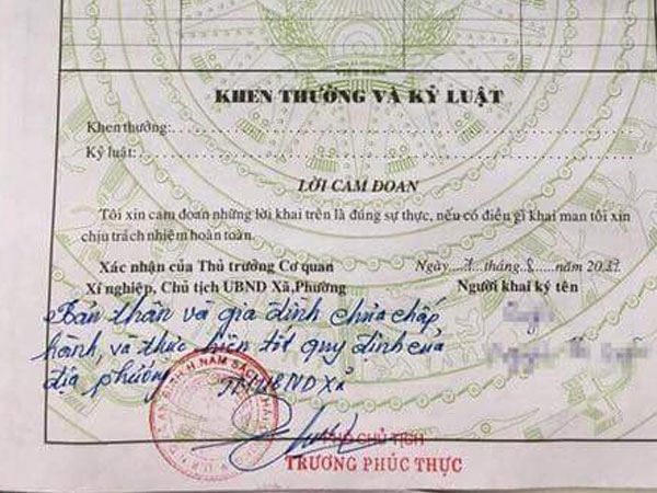 Đến xin xác nhận sơ yếu lý lịch nhập học đại học, tân sinh viên đã bị lãnh đạo xã bút phê "bản thân và gia đình chưa chấp hành chủ trương chính sách, quy định của địa phương".