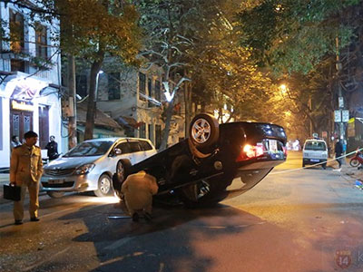 Vào khoảng 22h30 tối ngày 6/2, một chiếc ô tô 4 chỗ khi rẽ gắt từ phố Hòa Mã sang phố Thi Sách (Hà Nội) do không làm chủ được tốc độ nên đã tông vào chiếc taxi đỗ bên đường rồi lật nhào.