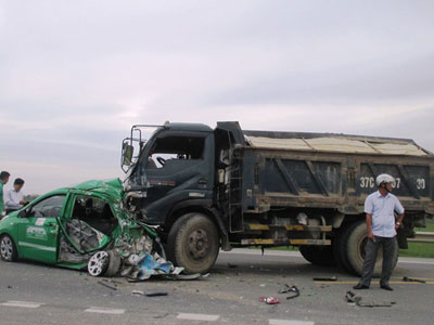 Rẽ phải đột ngột, taxi bị ôtô tải chạy cùng chiều phía sau tông mạnh. Bốn người nhập viện trong tình trạng nguy kịch.