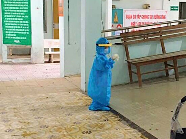 Hình ảnh bé trai thật xúc động, em hồn nhiên trùm bộ đồ bảo hộ phòng chống dịch Covid-19 kín mít, thả bước dọc hành lang giúp mẹ di chuyển đồ đạc rời khỏi khu cách ly để đến bệnh viện điều trị Covid-19 dành cho trẻ em.