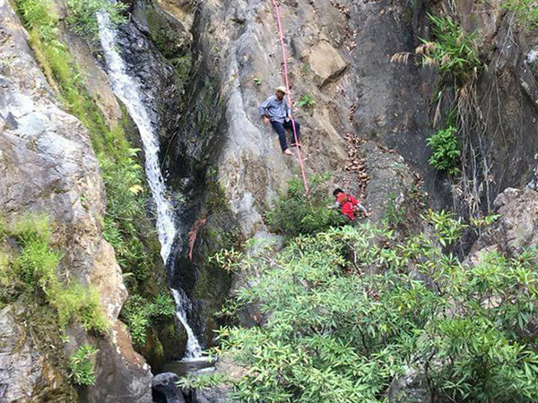 Do địa hình hiểm trở, thác nước dựng đứng, vị trí thi thể nạn nhân cách đỉnh thác cả 100m nên việc đưa nạn nhân lên gặp rất nhiều khó khăn.