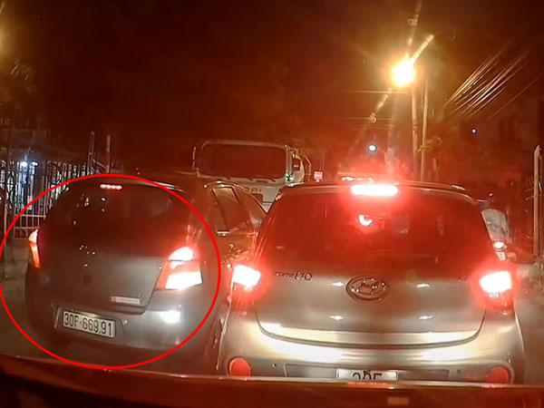 Hình ảnh từ camera hành trình cho thấy đoạn đường khá hẹp, các xe đang xếp hàng lần lượt đi qua cầu, đúng lúc này từ phía sau xuất hiện xe ô tô con BKS 30F-669.91 lấn làn vượt lên.