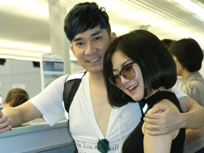 Hai ca sĩ nắm tay, ôm ấp nhau khi ra sân bay Tân Sơn Nhất làm thủ tục đi Mỹ lưu diễn.