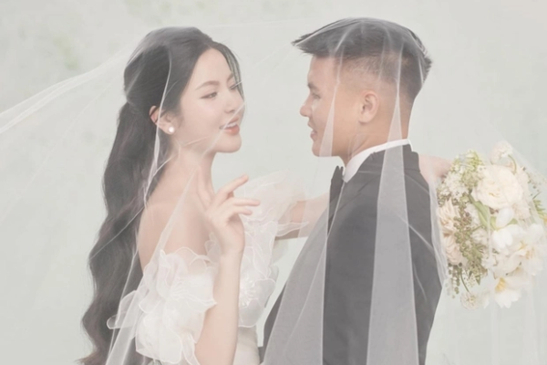 Quang Hải diện vest bảnh bao chụp ảnh cưới cùng Chu Thanh Huyền nhưng dân tình chỉ chú ý đến cách chú rể 'hack' chiều cao