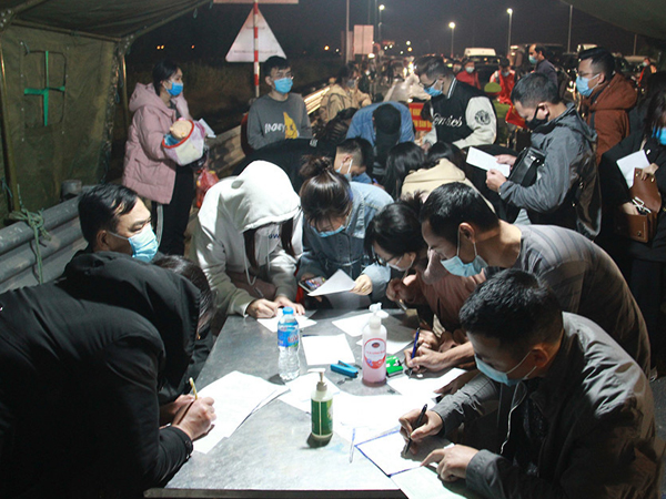 Ngay sau khi chốt kiểm soát người ra vào được lập tại trạm thu phí cầu Bạch Đằng (Quảng Ninh), hàng trăm người dồn về đây khai báo y tế để được đi qua.
