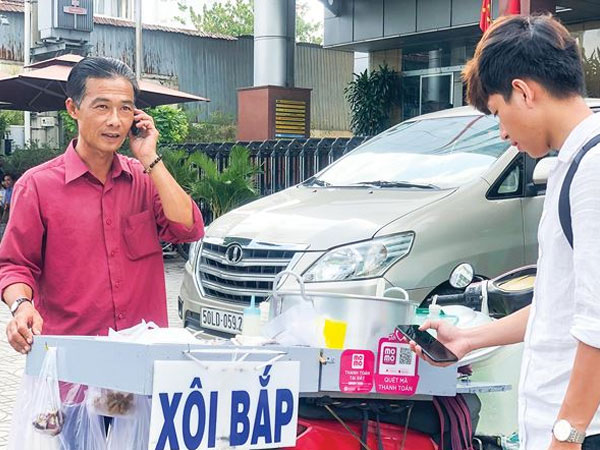 Không phải chỉ những nhà hàng sang trọng khách hàng mới có thể quẹt thẻ. Ở Sài Gòn, mua gói xôi, tô bún bò hay ly cam vắt… hàng rong, khách vẫn có thể quẹt thẻ thanh toán vô tư.
