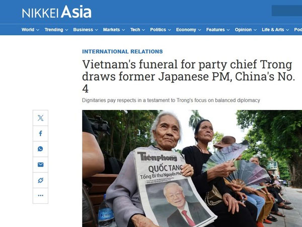 Nhiều hãng tin, hãng thông tấn lớn trên thế giới có bài viết mô tả chi tiết Quốc tang Tổng Bí thư Nguyễn Phú Trọng, cùng với những đánh giá về dấu ấn nổi bật của Tổng Bí thư trong 3 nhiệm kỳ lãnh đạo Việt Nam.