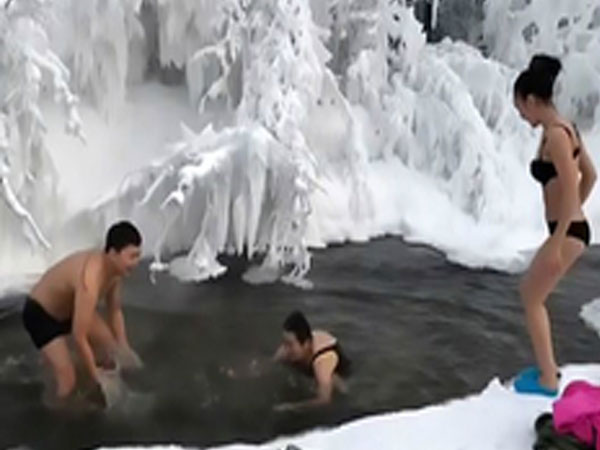 Ba du khách cởi đồ lội xuống suối nước nóng ở ngôi làng lạnh nhất thế giới Oymyakon khi nhiệt độ ở mức âm 65 độ C.