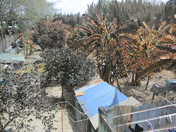Khu vực sang chiết được xây dựng tạm bợ. Hàng chục thùng nhựa xếp ngổn ngang trong khuôn viên công ty làm rò rỉ khí amoniac ra môi trường ở huyện Bình Chánh, TP.HCM.