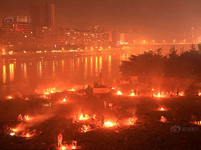 Người dân thành phố Đạt Châu, Tứ Xuyên đốt hàng trăm đống lửa bên bờ sông vào tối 24/8 nhân dịp "Lễ hội Ma" khiến khu vực này sáng rực và gây ô nhiễm không khí.