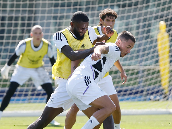 Các fan của Real Madrid phải nín thở khi chứng kiến trung vệ Antonio Rudiger có pha chuồi bóng nguy hiểm với Eden Hazard trong buổi tập.