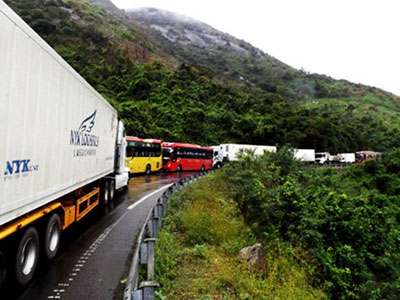 Sạt lở trên đỉnh đèo Cổ Mã gây ách tắc giao thông. Công ty cổ phần đầu tư Đèo Cả đã mở cửa hầm đèo Cổ Mã để 'giải cứu' tình trạng kẹt xe.