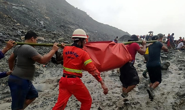 Đống bùn thải ở mỏ khai thác lộ thiên bang Kachin đổ sập xuống hồ nước bên dưới, gây "sóng thần" nhấn chìm những công nhân gần đó.