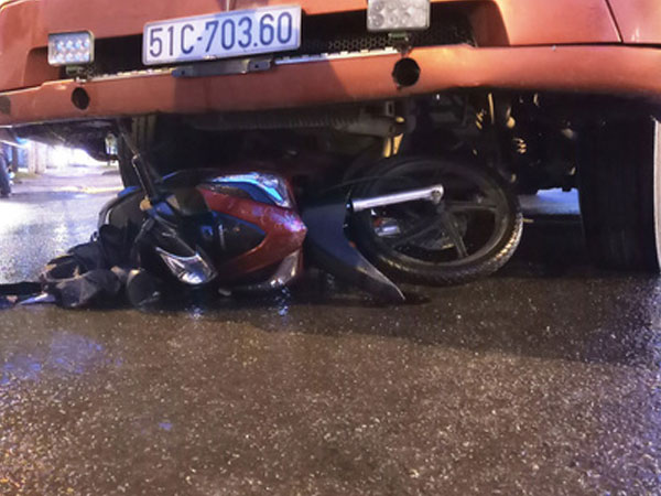 Chồng say chở vợ trên xe máy bị xe đầu kéo cuốn vào gầm