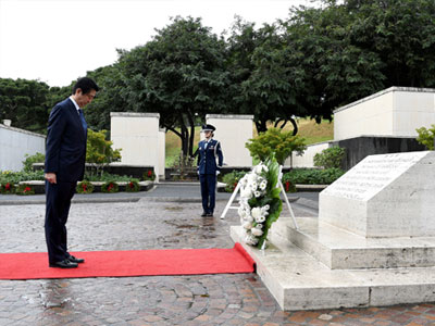 Thủ tướng Nhật Bản Shinzo Abe hôm qua dừng chân tại các đài tưởng niệm ở Hawaii, một ngày trước khi đến thăm Trân Châu Cảng để thể hiện tình đoàn kết liên minh với Mỹ.
