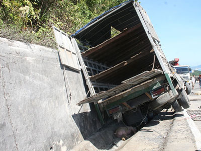 Cho đến trưa 10.7, lực lượng cứu hộ vẫn chưa đưa được chiếc xe tải chở heo bị lật trên đèo Hải Vân ra khỏi hiện trường vụ tai nạn.