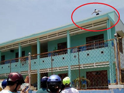 Thanh niên nghi ngáo đá leo lên sân thượng trường mầm non