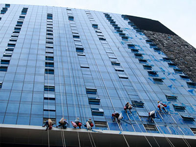 Hàng chục công nhân treo mình lơ lửng giữa không trung để lau kính bên ngoài tòa nhà cao 31 tầng trên đường Nguyễn Chí Thanh (Ba Đình, Hà Nội).