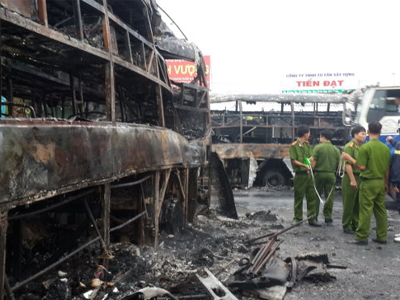 Hai chiếc xe khách giường nằm lưu thông ngược chiều trên quốc lộ rồi đâm vào nhau, bốc cháy dữ dội. 12 người chết cháy trong khi 40 nạn nhân bị thương.