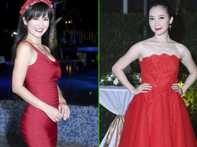 Hồng Nhung, Linh Nga diện váy đỏ rực đi sự kiện