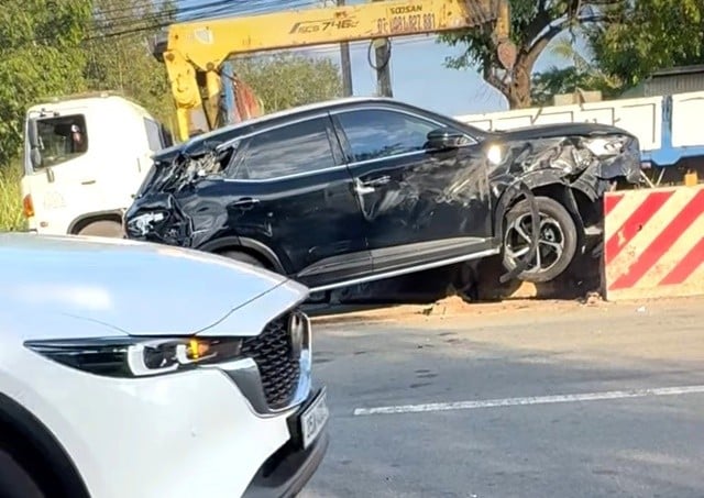 Sau cú va chạm với xe đầu kéo container, chiếc ô tô 5 chỗ bị hất văng vào khu vực dải phân cách trên Quốc lộ 13 (TPHCM), hư hỏng nghiêm trọng. Vụ tai nạn khiến người điều khiển ô tô con mắc kẹt trong cabin, phải nhờ người dân hỗ trợ đưa ra ngoài.