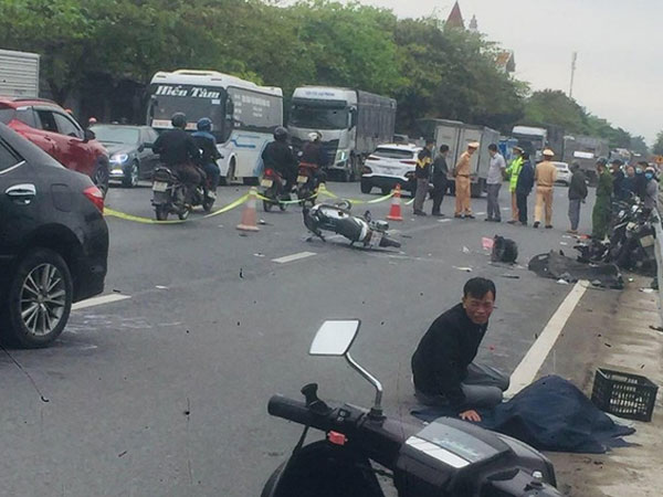 Nhân chứng cho biết, vụ tai nạn liên hoàn giữa 3 ô tô và 2 xe máy khiến ít nhất 2 nạn nhân văng từ mặt đường xuống chân đê, nhiều vết máu be bét tại hiện trường.