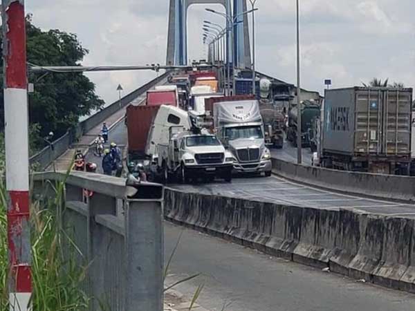 Vụ tai nạn liên hoàn giữa 2 xe container và một xe lắp đèn chiếu sáng công cộng trên cầu Phú Mỹ (TP Thủ Đức) khiến giao thông qua khu vực ùn tắc nghiêm trọng.