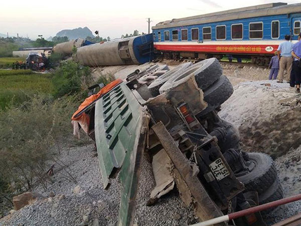 Vụ tai nạn giữa tàu hoả và xe ben chở đá khiến đầu tàu và 7 toa bị lật, trong đó có 4 toa chở hành khách.