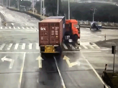 Do không làm chủ được tốc độ trong lúc vào cua, phần đuôi của xe tải đã va trúng đầu container khiến chiếc xe này lao xuống rảnh rồi lật nghiêng trên đường.