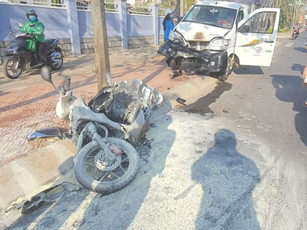 Ôtô tải tông xe máy văng vào trụ điện cháy rụi