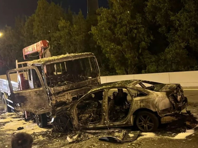 Ô tô đâm trực diện vào xe tải cẩu trên đại lộ Mai Chí Thọ (TP Thủ Đức), cả hai phương tiện cháy trơ khung, hai người tử vong.