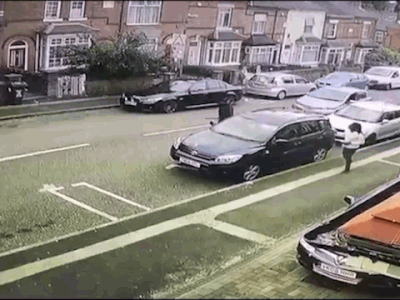 Khi đang cầm mã tấu truy đuổi người đàn ông mặc áo đen trên phố, tên côn đồ bất ngờ bị chiếc ô tô màu xanh tông văng lên vỉa hè. Sự việc xảy ra ở Erdington, Birmingham, Anh và đã được camera giám sát ghi lại.