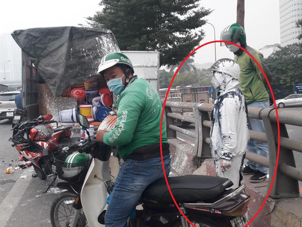 Theo những gì được ghi lại, chiếc xe máy đã đâm trúng đuôi ô tô tải chở vật liệu xây dựng. Pha va chạm đã khiến các thùng sơn trong ô tô tải vỡ nắp, văng tung tóe khắp nơi. 1 cô gái đang dừng xe bên đường đã lĩnh trọn sự đen đủi, khi bị sơn trắng phủ khắp người.